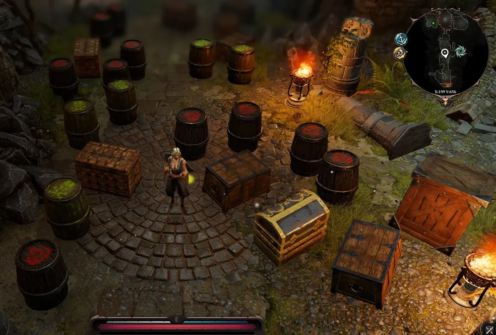 Подземное логово. Телепортироваться может и перегруженный герой, бочки удобно выгружать - много пустого места.