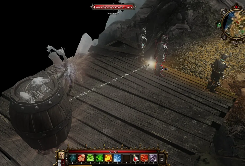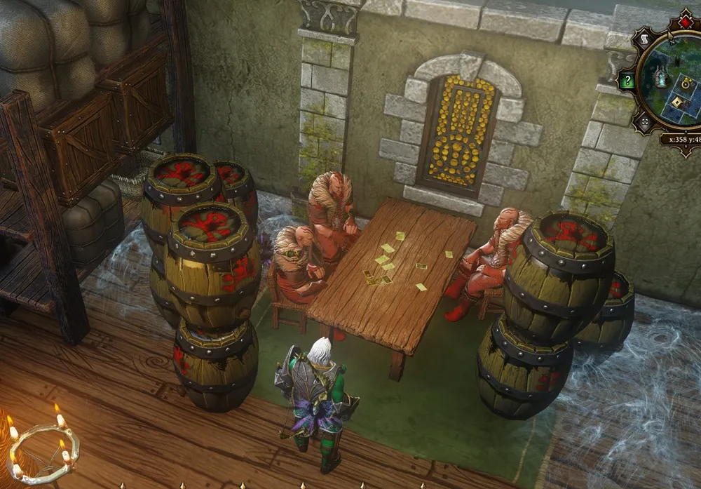 Для пробы поместил в рюкзак Баркоза пару бочек с маслом, переместился через портал – бочки на месте. Более того, их можно извлечь в любой момент и на любом расстоянии. Ну что же, пусть мёртвый напарник потрудится на благо Ривеллона; тем более, что ему абсолютно безразличен уровень нагрузки. Неожиданно викинг избавился от одной неприятной проблемы – постоянно бегать в Сайсил к организованному временному складу и сгружать в него бочки с маслом, ядом, руду и прочие громоздкие предметы.