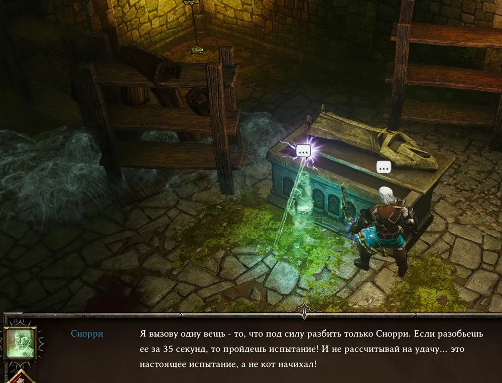 Олаф прошёл испытание: то самое, что предлагали ему пройти в самом начале пути; в пещере на побережье. И которое вынудило его одинокого предшественника отказаться от своей миссии: он не смог переставить корзину с углём на нажимную плиту и открыть двери. Бедняга не знал, что следовало попросить создателя вложить одно очко в умение «Телекинез», и он смог бы передвигать любые тяжести!