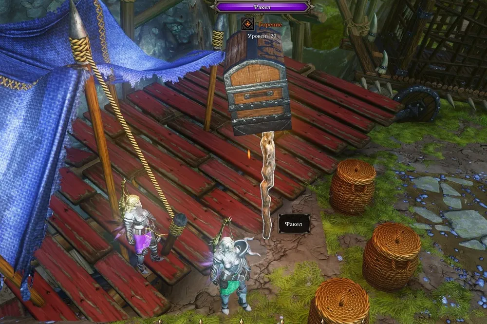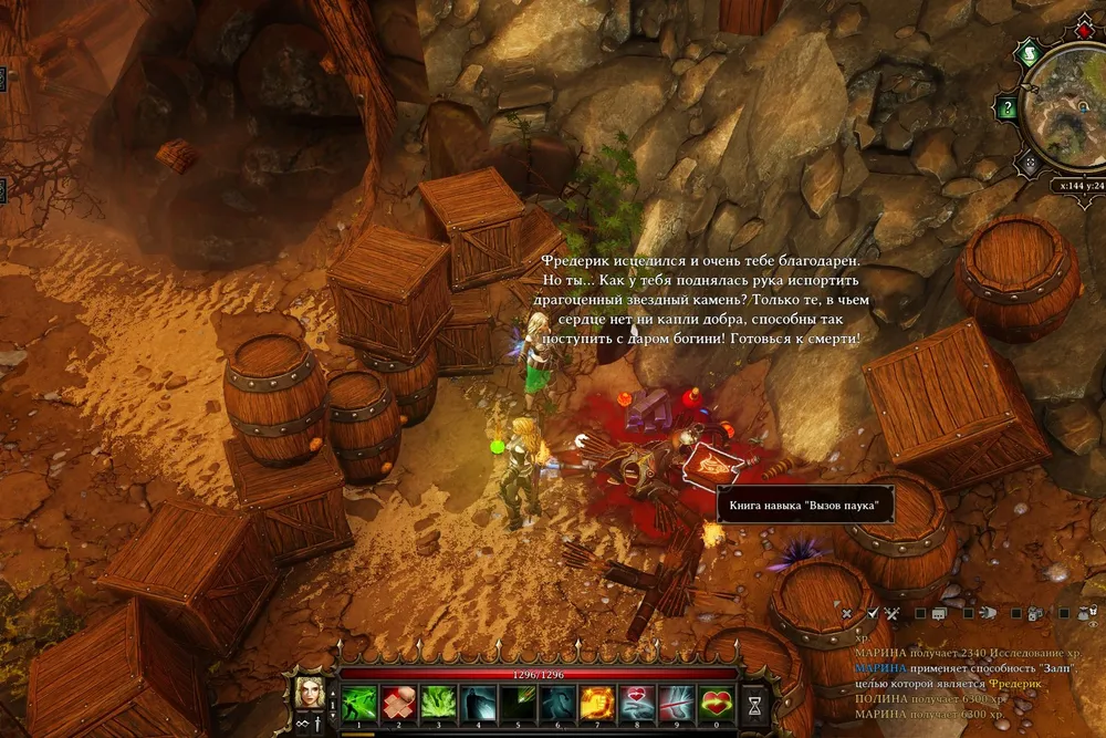 Знаете ли вы, что непорочный маг Фредерик, лежащий у подножия скалы и взывающий о помощи, является обладателем нескольких ценных предметов экипировки? Во время разговора их можно обменять на свои, но… Вылеченный при помощи кровавика Фредерик убегает и скрывается в своём убежище. (Возможно, его удастся обнаружить там, я не стал проверять.) Перед тем, как применять кровавик, блокируйте проходы ящиками и бочками.