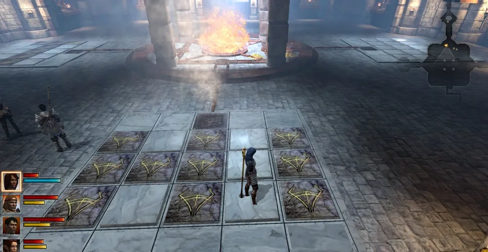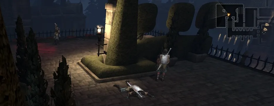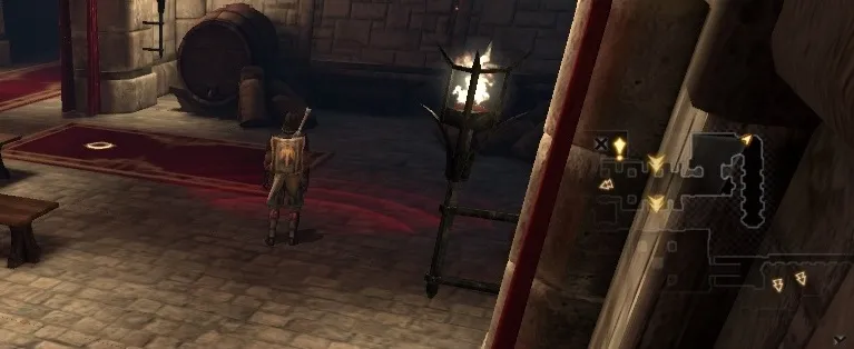 На этом месте вы можете заявить эльфийке, что пройдете поместье с боем, или выбрать «стелс-миссию». Во втором Хоук лишится возможности сражаться/колдовать, зато получит на время пару любопытных умений. Первое из них – отвлечение. Хоук кидает камешек, который привлекает внимание стражника. Пока тот вдумчиво разглядывает участок пола, можно будет легко проскользнуть мимо. Если вы не успели спрятаться в тени, вас автоматически перенесет к спрятавшейся в углу Таллис, и вы сможете попробовать снова.