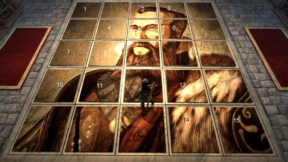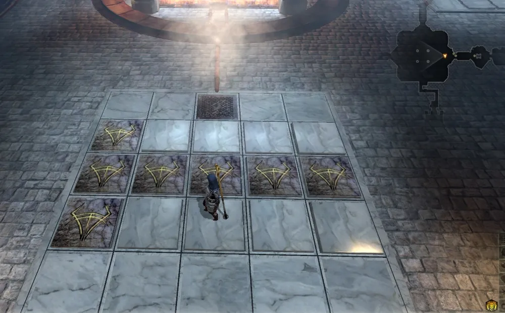В подвалах вас ожидает многочастная головоломка, и начинается она с того, что вам потребуется проникнуть за цветные двери с помощью особых аппаратов. Коснувшись их, ваш спутник получит над головой метку соответствующего цвета. «Раскрасив» спутников и Хоука, вы сможете получить доступ к ранее недоступным красящим аппаратам и на «смесителе» у входа получить новый цвет – зеленый. За зеленой дверью, впрочем, находятся только сундуки, а ваша цель – рунный голем за черной – белой – оранжевой дверьми. В его комнате вы найдете странную картину и аппарат оранжевой метки, которая пропустит вас дальше.