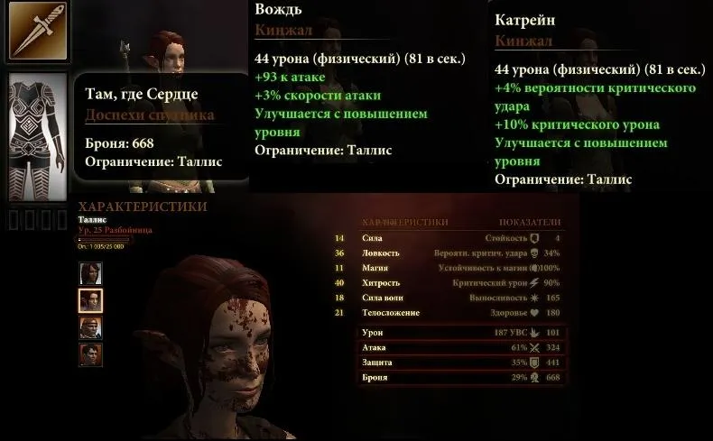 Как разработчики и обещали, она получила уникальную ветку шикарных умений наподобие как у остальных ваших спутников. Так же у нее имеются парные кинжалы, улучшающиеся с повышением уровня, и туча метательных ножей, не отображаемых в экипировке. Так же у нее нет улучшений доспеха и бижутерии, зато характеристики распределены таким образом, что замки не представляют для Таллис проблемы. Пару раз это пригодится.