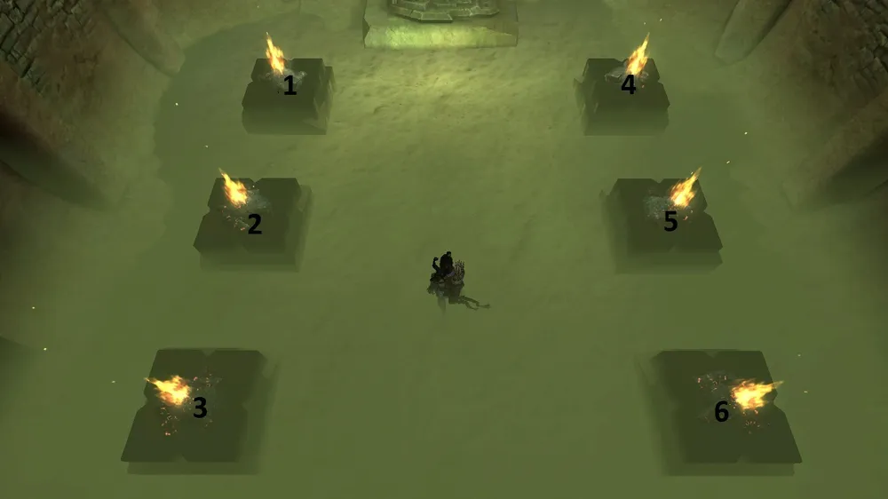 Эта загадка находится в локации "Тюрьма Корифея - основание башни". Необходимо зажечь все 6 факелов, чтобы открылся саркофаг, в котором находится часть сета (перчатки).