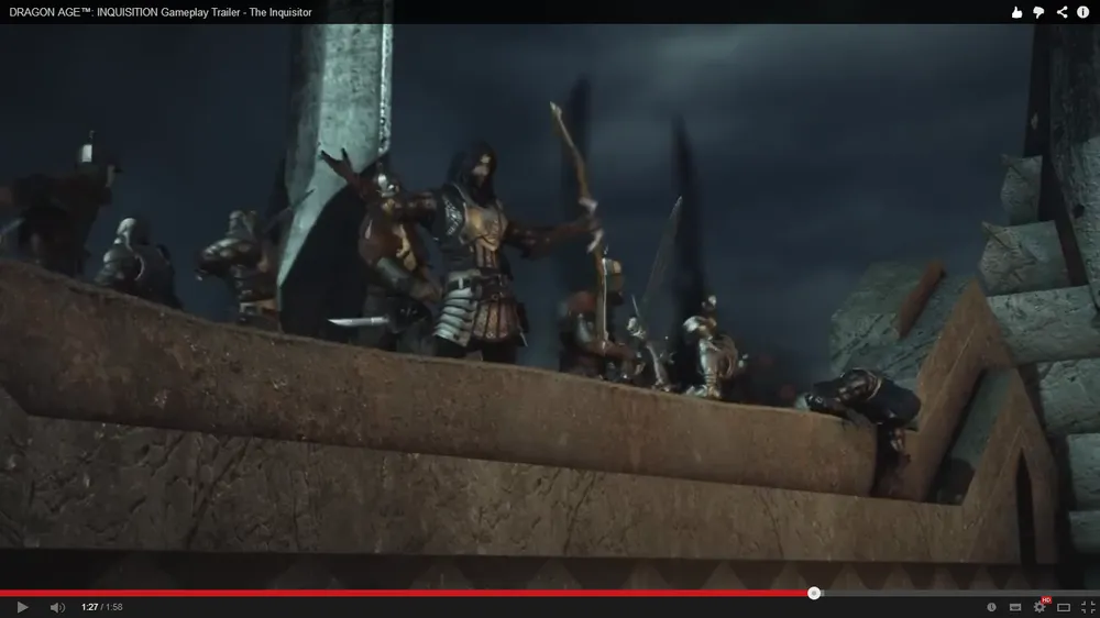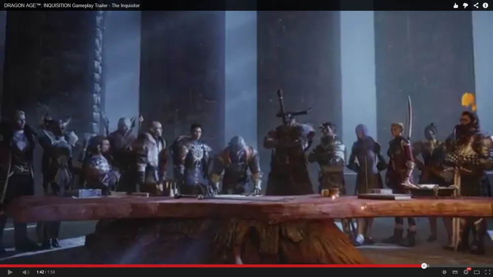 1:38-1:42 Показывают всех спутников нашего Инквизитора, их почему-то не 9 как обещалось, а 12 (Там между Варриком(тот самый гном) и Соласом(лысый эльф) кажется Коль)