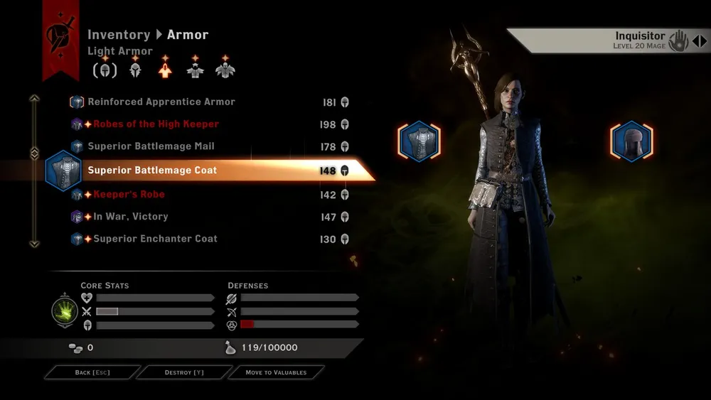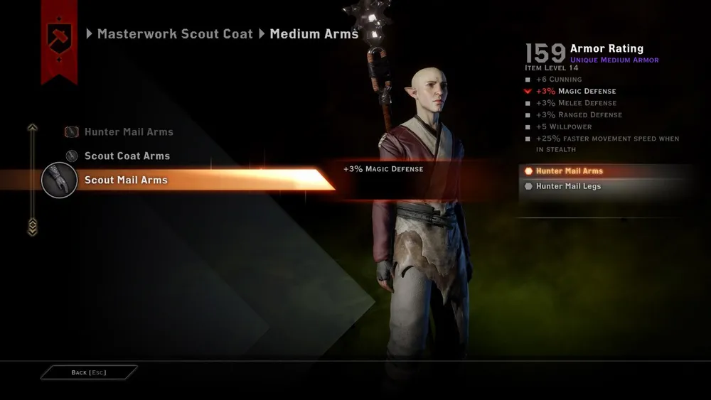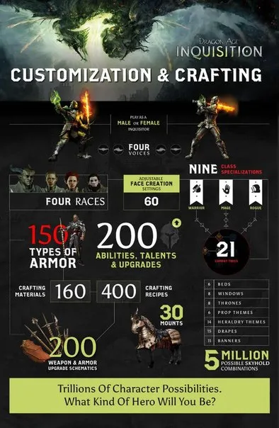 [МЛ]. Тем не менее, у каждого персонажа будет свой стиль, поэтому та же кольчуга чародея на Дориане, Соласе, Вивьен и Инквизиторе будет выглядеть по-разному. Основные признаки — в том числе цвета — при этом сохраняются: так, красное одеяние останется красным на любом персонаже, просто оно приобретет некоторые нюансы, отражающие личность владельца. В конце концов, в Инквизиции — целая армия кузнецов, они вполне могут добавить там и тут по паре прибамбасов. Само собой разумеется, знаковые доспехи (скажем, кольчуга Серых Стражей) сохранят свой символический вид, кто бы их ни надел.