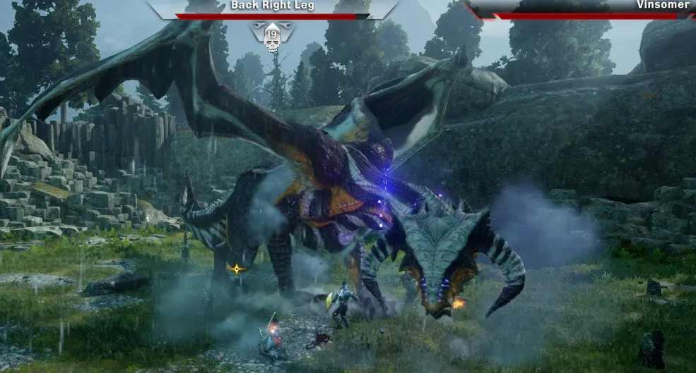 Когда начнется битва не стоит все внимание концентрировать только на «Винсомере», так как ее дракончики тоже могут изрядно попортить вам жизнь. Урон от физических атак драконицы такой же, как у вышеописанного высшего дракона. Винсормер весьма активный противник, любящий атаковать менее защищенных разбойников и магов. Ее сильный рев может оглушить всю партию. Через определенный период времени шея этого дракона начнет покрываться электрическим полем – в этот момент рекомендую держаться от «Виносмера» как можно дальше.