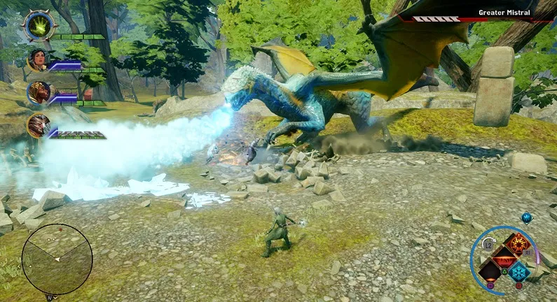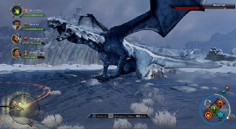 Чтобы снизить урон, получаемый от атак «Большого Мистраля», необходимо экипировать своих спутников и главного героя в броню, имеющую сопротивляемость к холоду. Как и прочие высшие драконы, она иногда создает завихрения с помощью своих крыльев. Также у нее есть способность под названием Ледяная броня, добавляющая дополнительную шкалу жизни. В полете драконица может запустить ледяной шар в одного из членов вашей партии. В этом случаю рекомендую взять управление этим персонажем в свои руки, так как Al, бывает, тормозит и не пытается увернуться от атаки. Сражение с «Большим Мистралем» может продлиться немало времени, а потому запаситесь лечебными зельями.