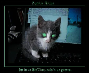 Имеет ли мем Zombie Kitten отношение к игре, вопрос открытый. В ЧАВО можно найти вопрос «Will there be zombie kittens in the game?». «Спонтанно» возникают zombiekitten-треды на форуме, художник-куны рисуют фан-арты, моб неистовствует. Будучи ответственными винтиками бездушного механизма глобализации, мы не можем не поддержать эту благородную инициативу. Вот наш вклад в общее дело:
