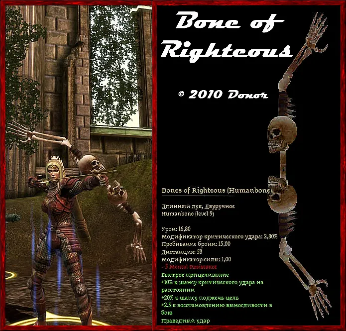 Лук создан из нового материала "Человеческая кость", имеющего свои уникальные характеристики ! Для полноты картины, специально для применения с этим материалом, в статы оружия мной добавлено