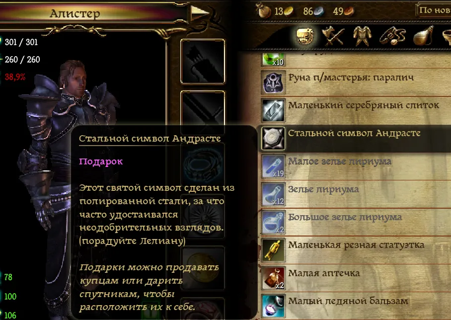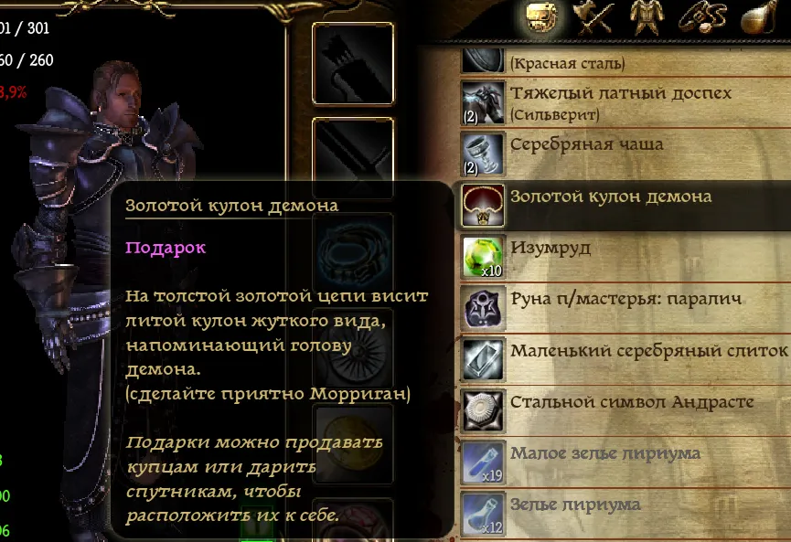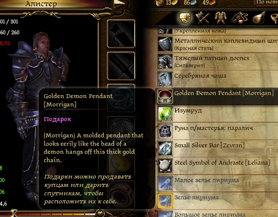 И да, и нет, друзья. Дело в том, что я, как большой поклонник русского языка в играх, не мог смириться с тем, что один из этих модов полностью англофицировал и подарки вашим компаньонам и их описание, а второй добавлял к названию подарка имя того кому подарок предназначен в непонятного вида кавычках, опять же на английском. Как то сухо и не очень эстетично.