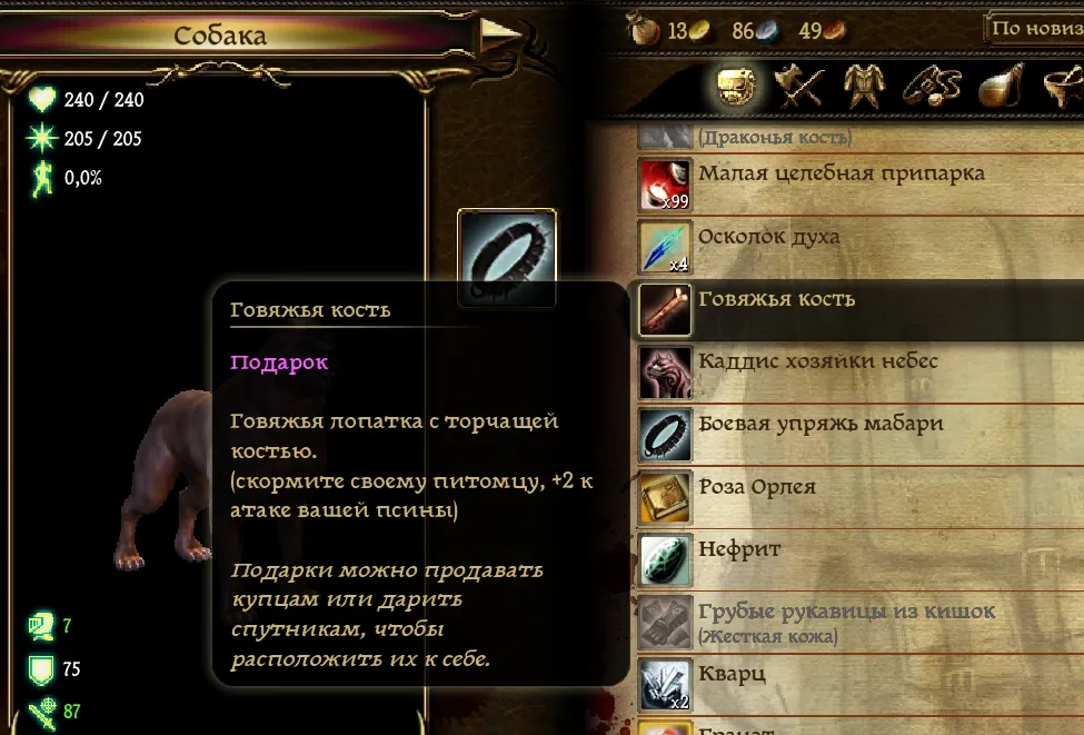 Кроме того есть ещё одно немаловажное обстоятельство почему я решил делать самостоятельный мод. Есть на Да-нексусе замечательный мод Dog Gift Tweak от автора kend7510. Автор этого мода озаботился подарками для вашего мабари. Так как отношение собаки к вам всегда запредельно высокое, дарить ей подарки как бы не имело особого смысла. Так вот, мод делал так, что теперь получая от вас кости собака улучшает свои характеристики. Всё бы хорошо в этом моде, да НИГДЕ в игре вы не найдёте описания, что же конкретно улучшает та или иная кость. Чтобы разобраться надо было либо идти в интернет и читать описание на странице мода либо пробовать в игре и проверять методом тыка. НУ УЖ НЕТ!!! Поэтому я в своём моде при описании подарков для собаки добавил описание тех бонусов, что дают вам кости от мода Dog Gift Tweaks. Рекомендую поставить и его