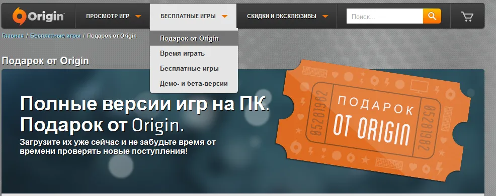 2. Зайти в Магазин и во вкладке бесплатные игры найти "Подарок от Origin";