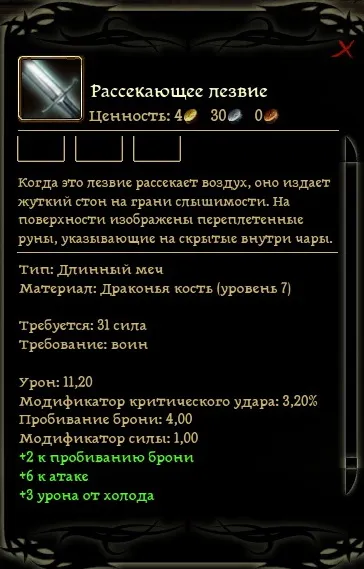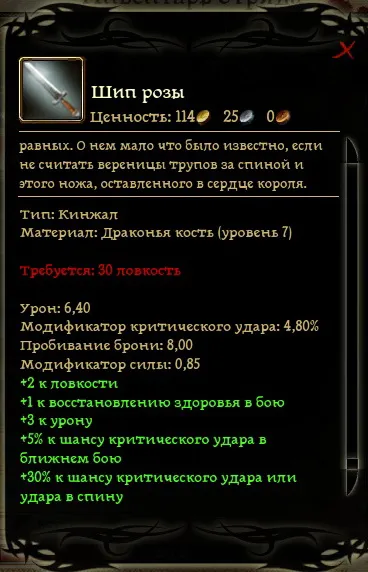 С него надо попросить максимальную стоимость 75 золотых, но столько он не сможет отдать при любом раскладе – получаем 65 и кинжал ворона в придачу. НО не заканчиваем разговор и интересуемся зачем ему нужен лириум, узнав что он с ним делает под угрозой раскрытия заставляем его дать сверху ещё 8 золотых. Возвращаемся к Рогеку и убеждаем старого контрабандиста дать не 20, а 30 золотых за работу. Итого: 63 золотых монеты чистой прибыли и не плохой кинжал.