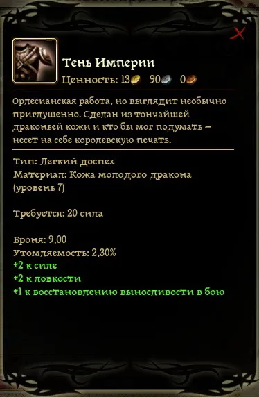 у Легнара товар побюджетней –Тень империи (второй по полезности в игре лёгкий доспех) и не плохие подарки для некоторых спутников.