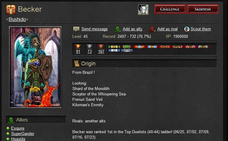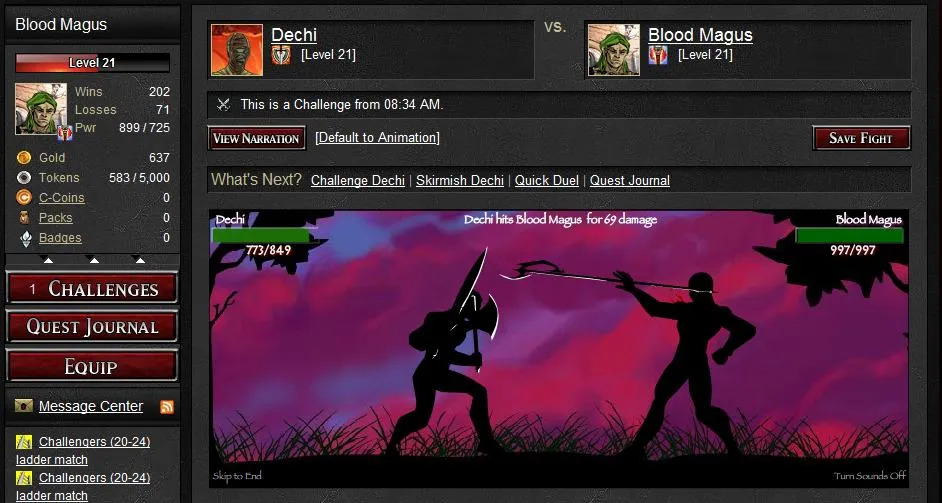 DUELS - браузерная тактическая RPG нового поколения от Challenge Games, предлагающая увлекательные дуэли и квесты. Игра отличается высококачественной графикой и развитым рынком. Идеальна для любителей стратегий и создания оптимальных билдов персонажей. Подходит для тех, кто не хочет тратить много времени на игровой процесс.