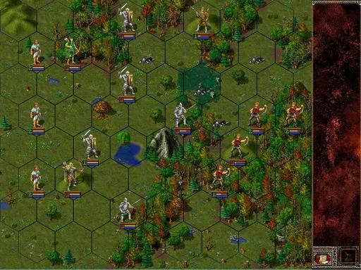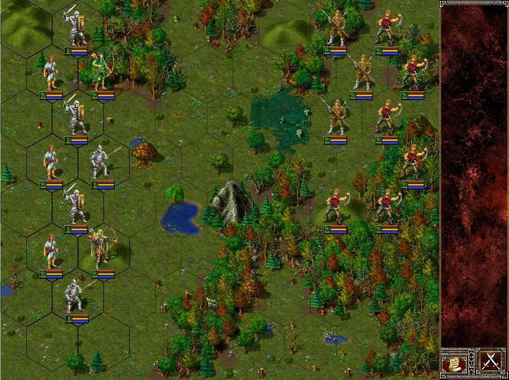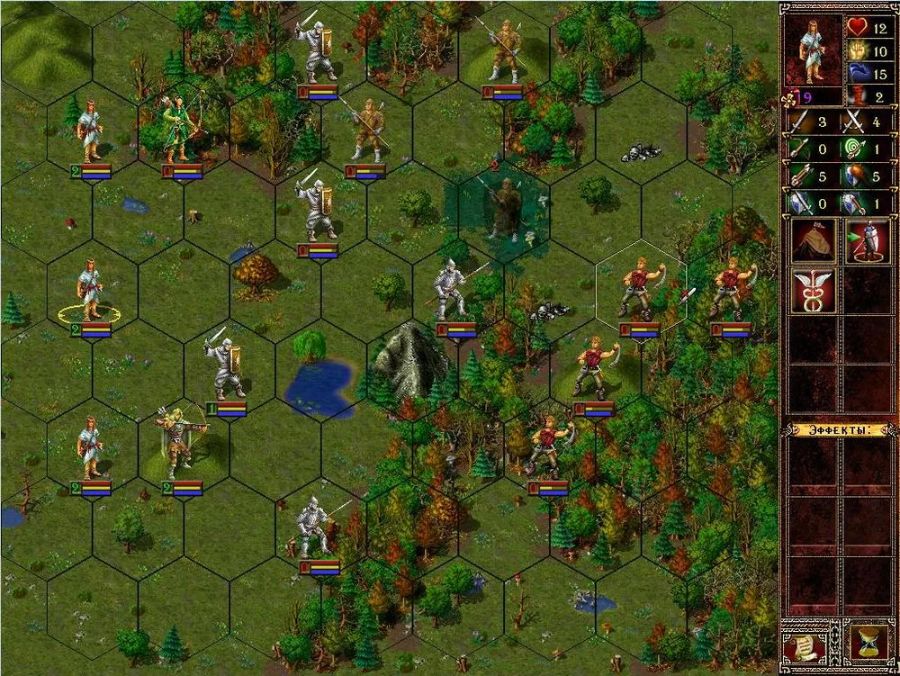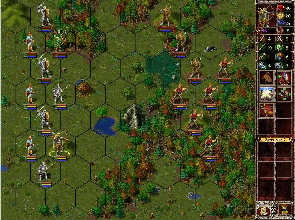 Разные типы местности дают разные бонусы, например, лес дает защиту от стрел +2, а холм дальность выстрела и защиту +1.