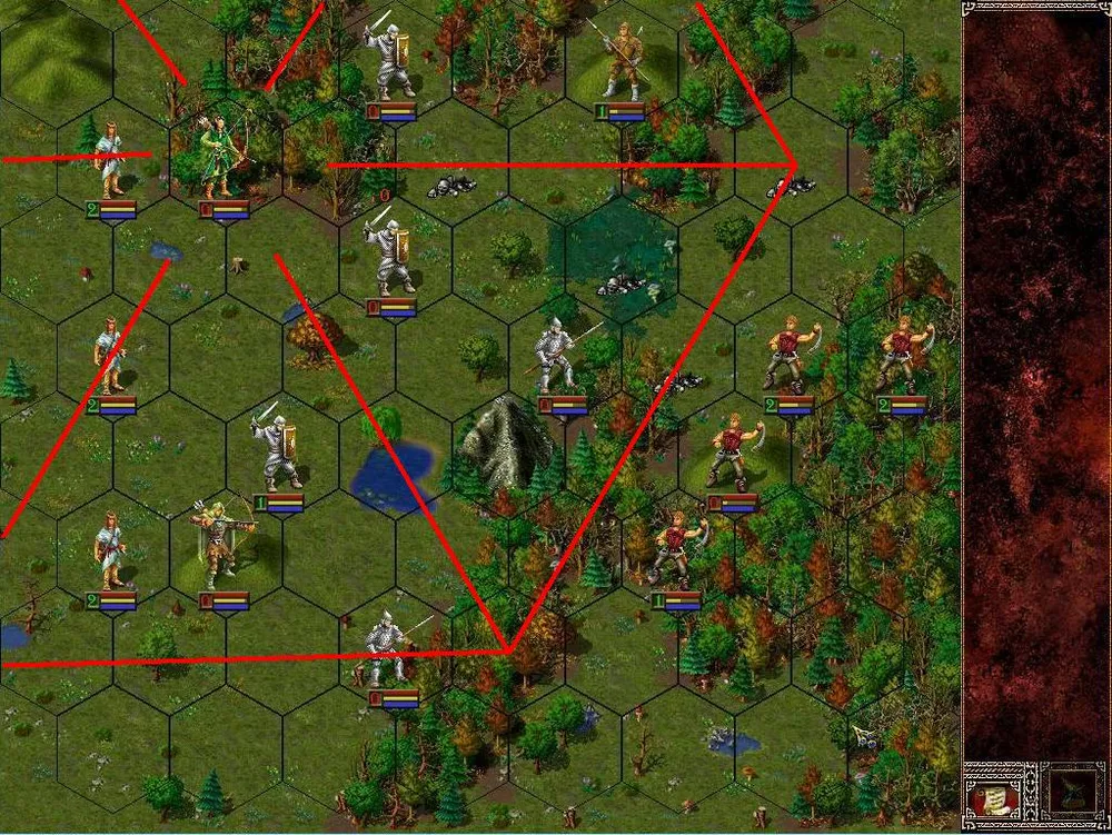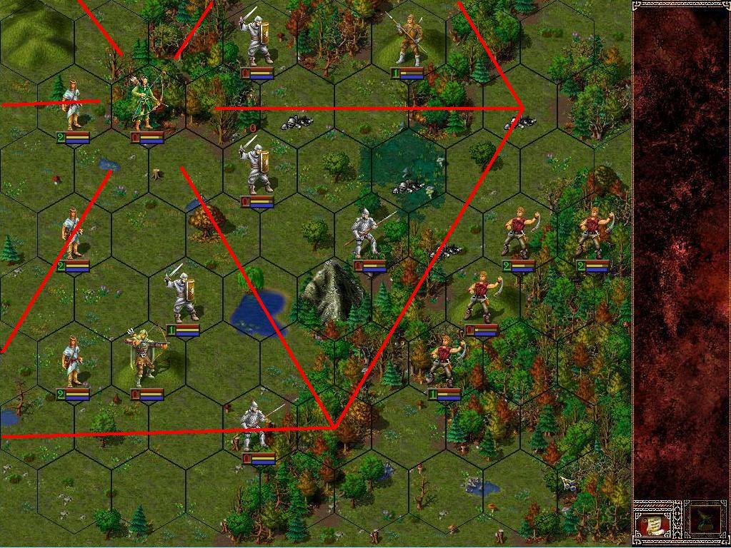 Если ваш лучник находится на холме, то дальность выстрела увеличивается на единичку. Мой герой, с его-то дальностью, может обстреливать все поле. Красные кружочки означают, что этот боец находится в зане поражения.