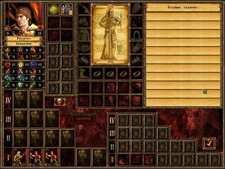 Командира я не забыл, просто он немного отличается. Все его умения направлены на усиление отряда: увеличивают урон, хиты, сопротивление и защиту и т.д. Сам он потянет максимум на бойца второго уровня, зато он единственный герой, который может себе позволить полностью заполненные ячейки войск. Из брони и оружия может носить среднюю и более легкую броню, холодное и обычное оружие а так же знамена (тоже дают какой-нибудь плюс отряду). Честно говоря, я пока всего один раз за игру встретил такое чудо как знамя, но все еще впереди.