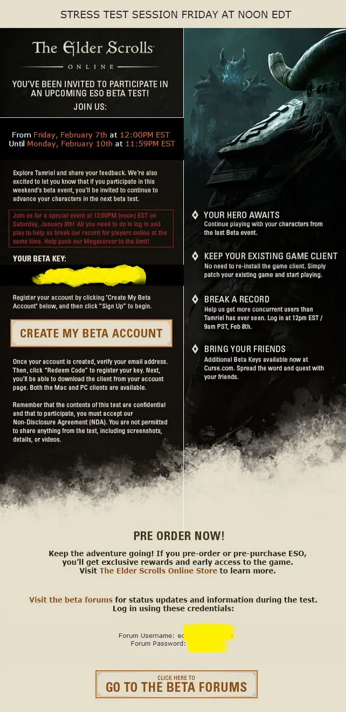 27 марта началась рассылка первой волны приглашений на бета-тест Elder Scrolls Online. Проверяйте свою почту! Не отчаивайтесь, если не получили приглашение – последующие волны будут больше. Узнайте, как записаться, когда начнется тестирование и что вас ждет на бета-ивентах.