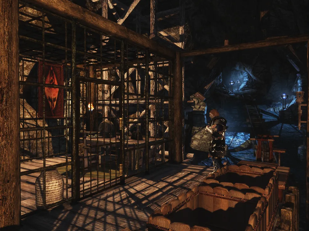Еще один кадр стеклянных шахт Вирнеда. Легионеры и боевые маги строго охраняют владения графа Вирнеда. Но какой-то хаджит пробрался в шахту и аккуратно подкрадывается к стражнику...
