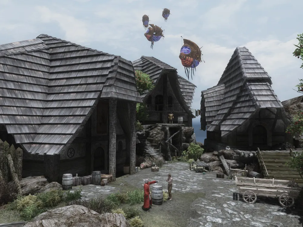 Так выглядит одна из улиц Литура, поселения, основанного данмерами примерно 300 лет назад. Литур располагается на каменистом плато Ольмаг, находящегося далеко к востоку от столицы Андорана. Кроме своеобразной архитектуры, обратите внимание на парящих над городом нетчей.