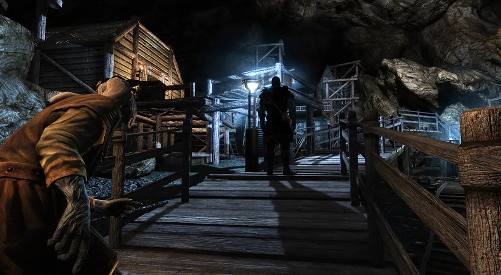 Изображение шахты Вирнеда, точнее опорного пункта, из которого можно видеть ее начало, освещаемое магией. Почему не используют обычные факела? Из-за опасности взрыва горючих газов, скапливающихся под землей.