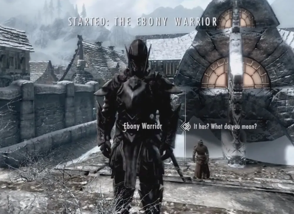 Теперь расскажу о самом рыцаре. Экипировка у него очень хорошая, я бы даже сказал - отличная. Торс на регенерацию здоровья, ботинки на защиту от ледяной магии, и так далее. Поднимите свою челюсть и читайте дальше. Получается, что у нашего Довакина получился очень хороший соперник, но все равно его можно победить. Ах да, забыл. Эбонитовый воин умеет пользоваться криками и может скинуть вас со скалы во время битвы, но вы тоже можете это проделать. Вопрос: кто быстрее?