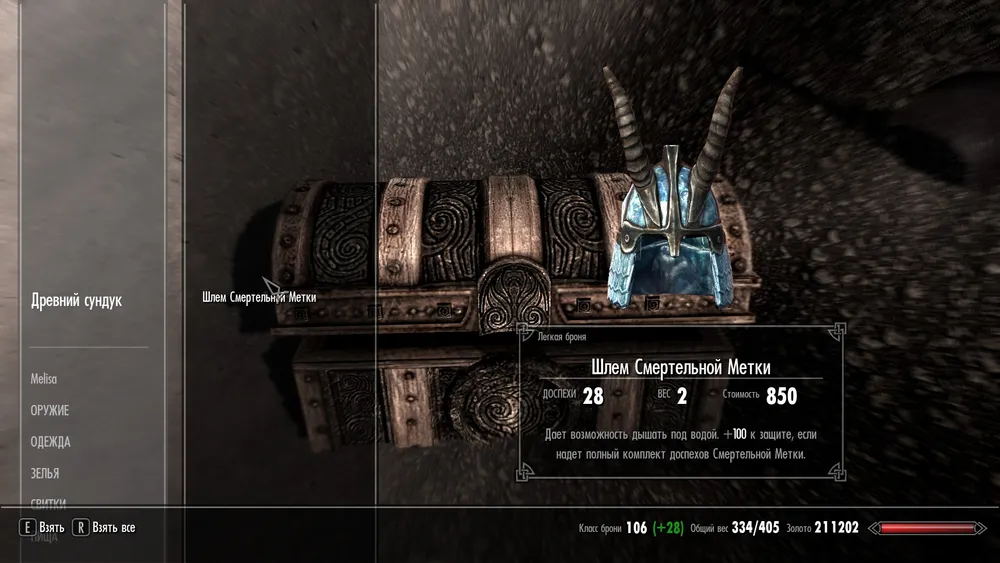 • Шлем находится на отмели Хрокнира, там, где мы убили главаря пиратов. Взламывайте древний сундук и забирайте первую часть доспехов.