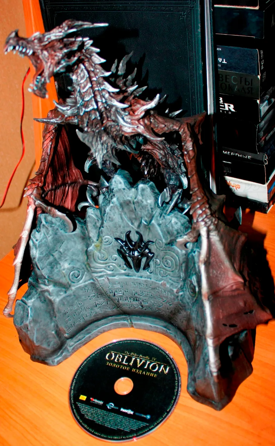 И наконец, главное. В западном коллекционном издании Oblivion главной ценностью была монетка, так как сложно было придумать фигурку, которая олицетворяла бы всю игру сразу. В Skyrim найти такого персонажа очень просто: