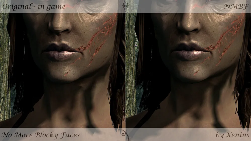 Одним из первых модов, на которые я обратил внимание, был No More Blocky Faces от пользователя Skyrim Nexus с ником Xenius. Вот этот самый мод и убирал "квадратность" и добавлял детализации текстурам лиц персонажей Skyrim. В последствии Xenius выпустил еще несколько модов (Detailed Faces, Detailed Bodies, Detailed Lips, No More Blocky Faces, High Quality Eyes, High Resolution Scars, ...) и, в конце концов, объединил все свои работы в один пак Xenius Character Enhancemen.