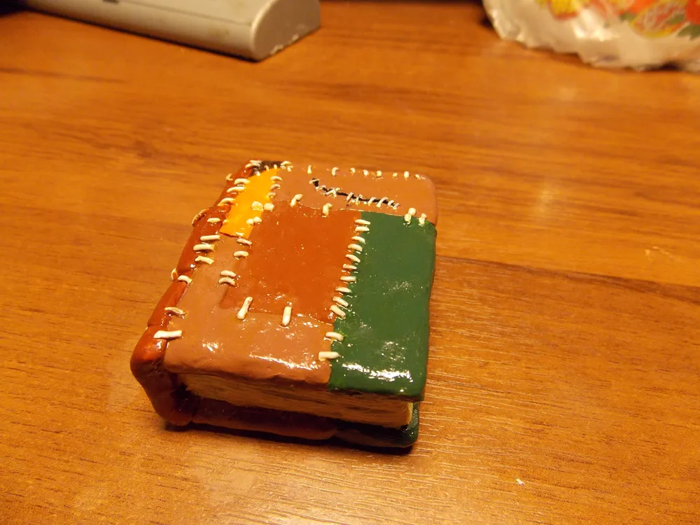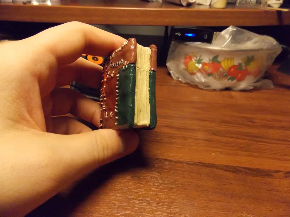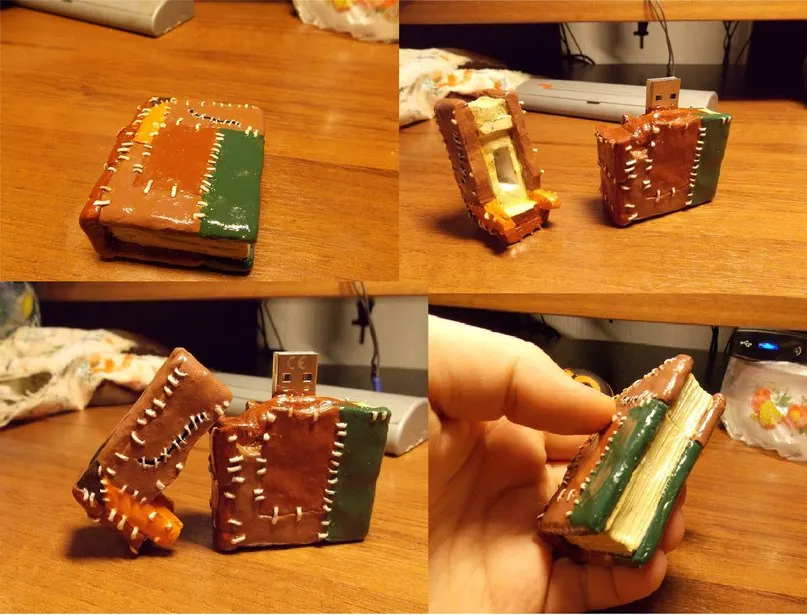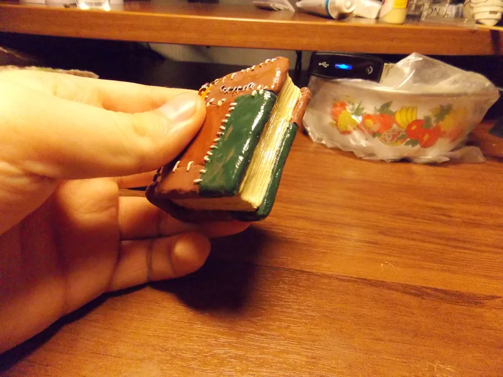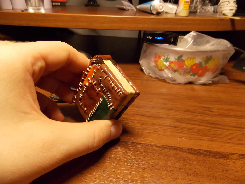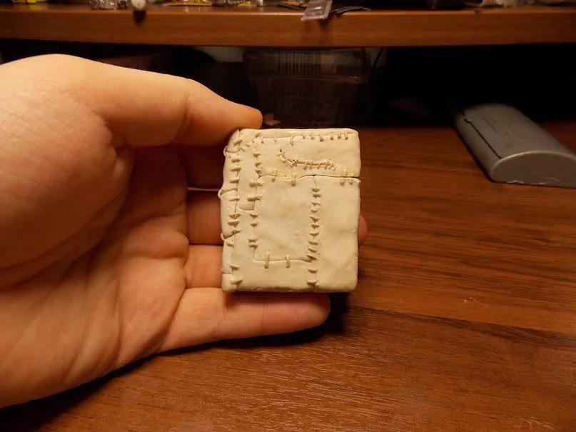 Далее опять же сопоставимо с оригиналом из игры вымеряем толщину изделия. Соединяем обе части с помощью полимерной глины (Где будет располагаться корешок книги можно залепить глиной ровно до края, с других сторон, где будет текстура страниц следует отступить от края около 4мм, т.к. ещё нужно будет сделать эти самые страницы. Так же не следует забывать, что внутри будет стоять флешка, и нужно оставить для неё полость).
