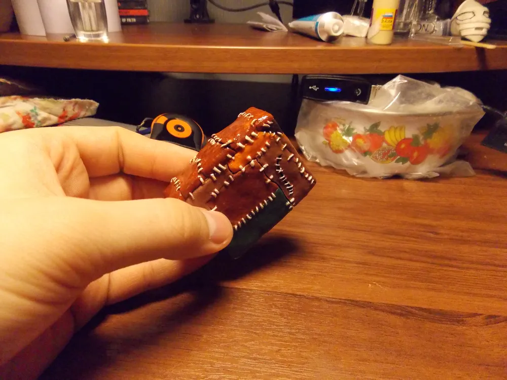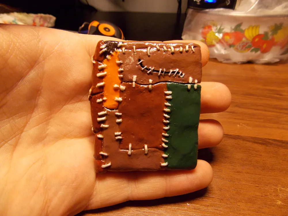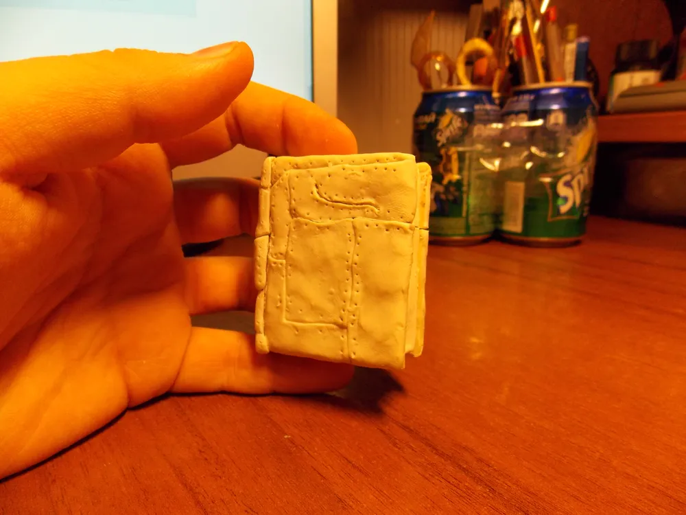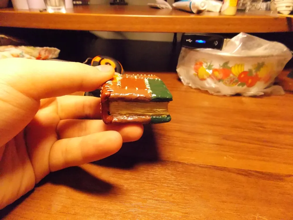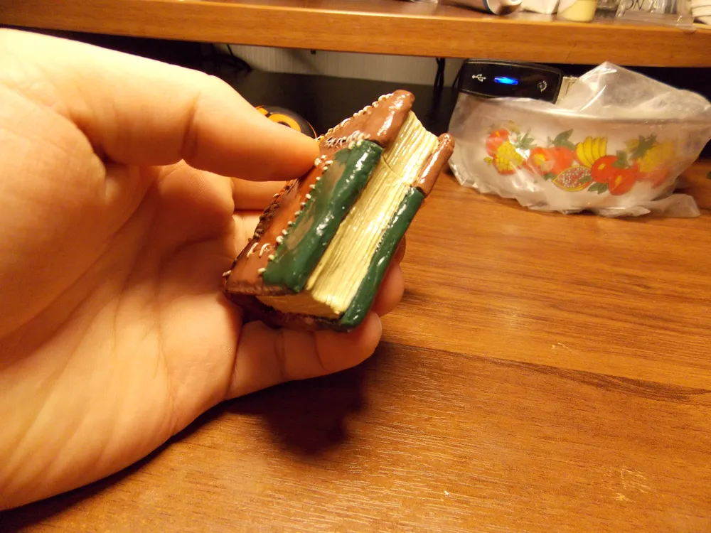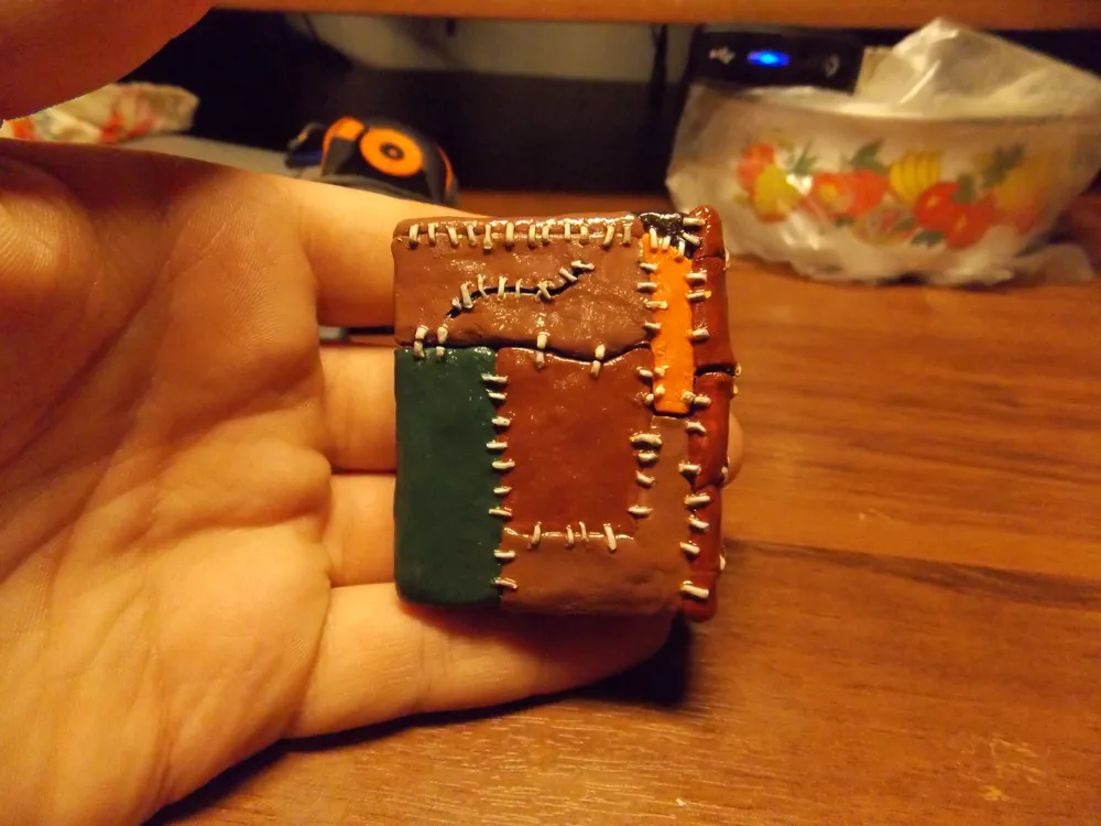 Далее опять же сопоставимо с оригиналом из игры вымеряем толщину изделия. Соединяем обе части с помощью полимерной глины (Где будет располагаться корешок книги можно залепить глиной ровно до края, с других сторон, где будет текстура страниц следует отступить от края около 4мм, т.к. ещё нужно будет сделать эти самые страницы. Так же не следует забывать, что внутри будет стоять флешка, и нужно оставить для неё полость).