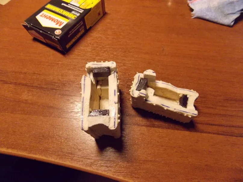 Далее берем магнит, я использовал магниты из холодильника (которые у меня валяются уже лет 10 без дела) и с помощью гравера (если его у вас нет, то помогут напильник, наждачная бумага и опять же не заменимый Русский мат...) выпиливаем 4 прямоугольника шириной с внутреннюю ширину стенок и с помощью суперклея приклеиваем их параллельно к крышке (верхняя часть) и корпусу (соответственно нижняя часть) флешки так, чтобы они соприкасались. Места куда их вклеиваем подрезаем резцом.