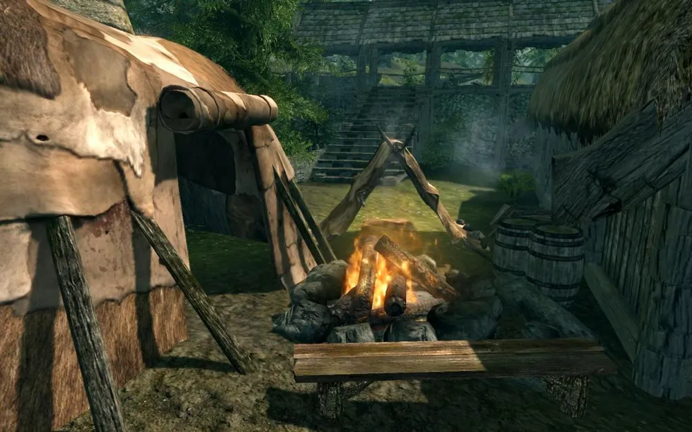 Спальник, котелок, очаг с котелком для готовки, дрова, цели для тренировки, скамья, верстак, дубильный станок и алхимическая лаборатория.