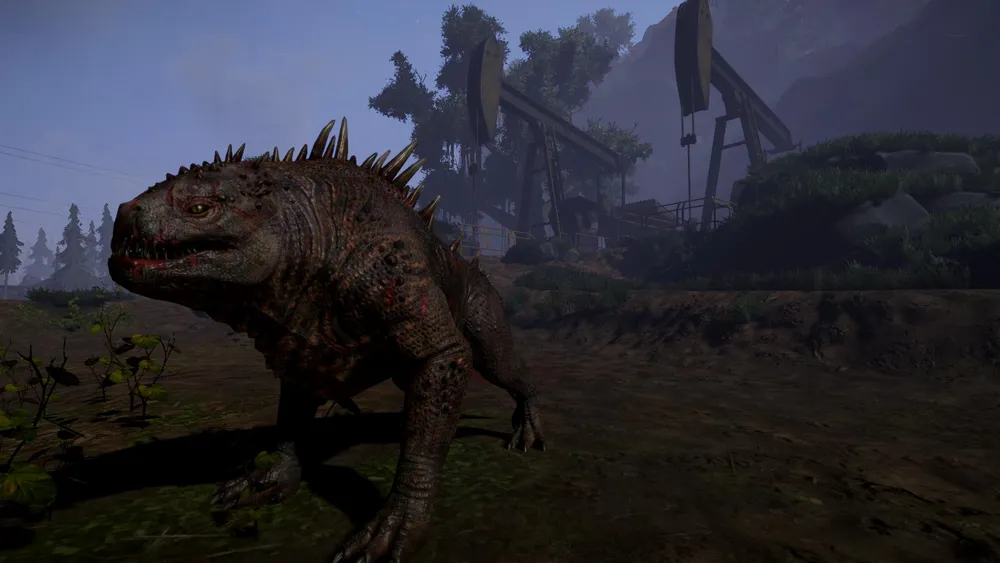 Этого монстра уже демонстрировали, так что ничего нового. Правда, ранее он выглядел совсем облезлым. А теперь похорошел - шипы и шкура-чешуя мне понравились. Судя по ранам (или шрамам) беззащитную ящерку уже успели покоцать. Выжженная солнцем, вытоптанная, каменистая земля, на которой проклёвывается чахлая растительность. На заднем плане красуются станки-качалки, неужто бандиты втихую добывают нефть? Вряд ли, скорее элекс. Всё-таки этот ресурс повсюду, "я чувствую его в воде, чувствую в земле, ощущаю в воздухе", так что получить его можно различными способами. Впрочем, зачем бандитам прилагать столько усилий, если их тактика - "хватай и беги"? Странно, очень странно. Хотя, я могу заблуждаться в своих предположениях, но официальной информации пока нет, вот и приходится фантазировать.