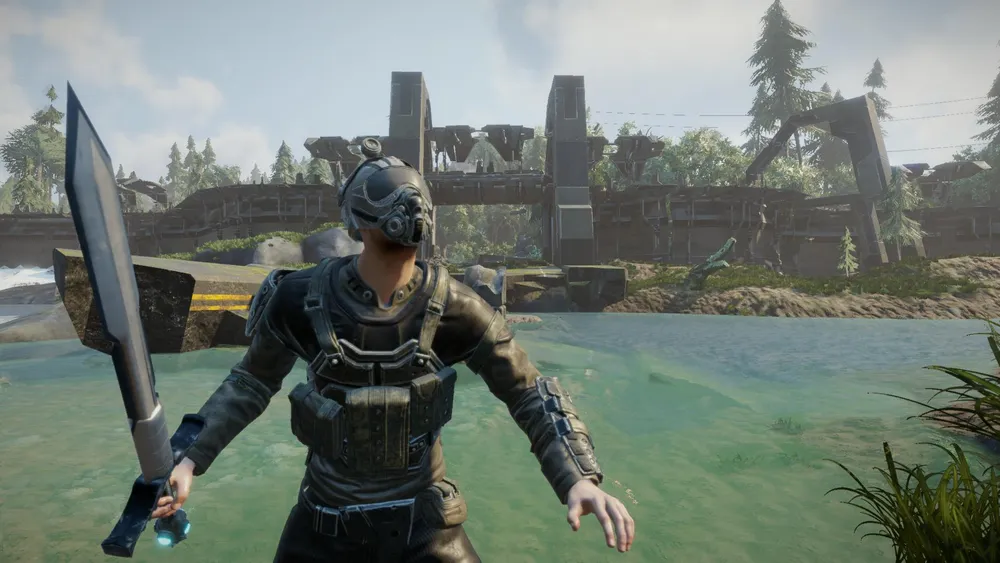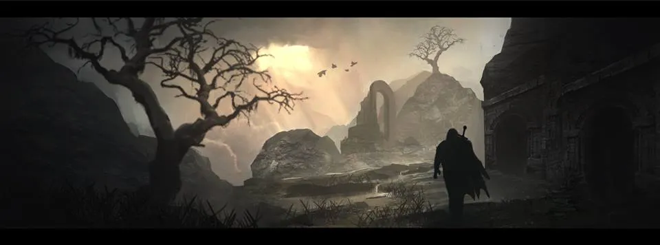 Интересная картинка. Протагонист в странном на вид "шлеме-противогазе", вооруженный (всё тем же?) убогим мечом. Меч каким-то образом работает на элексе, но принцип действия пока не ясен. Сперва мне показалось, что это самое начало игры, а на заднем плане обломки космического корабля (игра начинается с того, что герой упал с небес на землю), но, судя по проводам (линия электропередач?) это база бандитов, которые строят свои убежища из всякого хлама. На берсерков это не похоже - там деревянные избы и водяные мельницы, а клерики юзают высокие технологии, а значит и база у них должна быть посолидней. Водоём имеет какой-то нездоровый цвет, словно вода отравлена.
