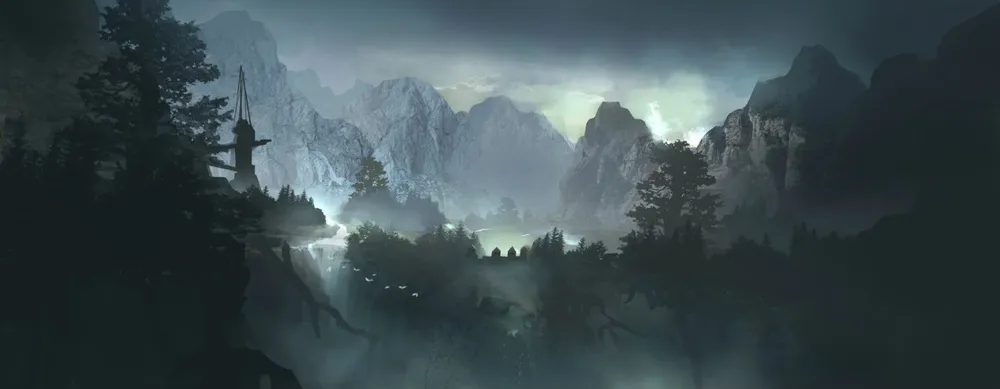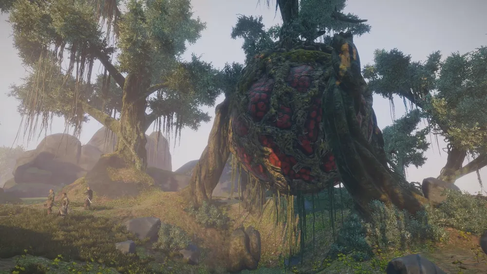 Странная штуковина на дереве - по непроверенным данным - некий "дух леса". То есть, возможно, это какое-то живое существо. Но по мне так - напоминает скорее улей, из которого вот-вот вырвется рой кровавых шершней. Судя по освещению и туманной дымке - сейчас прохладное раннее утро, берсерки пошли на охоту. А пейзаж, кстати, не поражает воображение. Заурядно. Разве что деревья нарочито гигантские, как бы с намёком на мутацию (после падения метеорита мутировал не только животный, но и растительный мир). Нам показывают, что с момента "конца света" прошло много времени, и планета уже оправилась от потрясения.