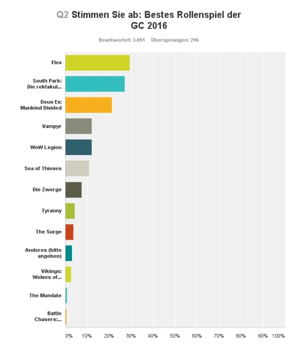 Несмотря на сокрушительно провальные презентации, разработчикам не удалось отвратить фанатов от драгоценного ELEX'а, более того - похождения экс-наркомана заняли аж 1 место в категории "Лучшая RPG" (из ожидаемых) по версии читателей журнала GameStar. ELEX набрал 29% голосов и обошёл такие игры как South Park, Deus Ex и Vampyr.