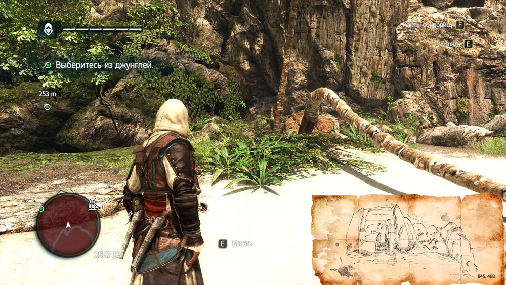 Другую разновидность загадок из «Blасk Flаg» – зарытые сундуки – смело можно причислить к нововведениям. Периодически Эдварду попадаются карты сокровищ – рисунки-схемы, где крестиком отмечено место залегания клада и указаны его географические координаты. Для того чтобы добыть спрятанные кем-то ценности, необходимо найти на карте игрового мира островок или участок побережья с нужными координатами, отправиться туда и уже на месте определить, где именно копать. Орлиное зрение и иные уловки здесь не помогут – только умение соотнести изображение на рисунке и реальный ландшафт. В большинстве зарытых сундуков наш герой найдет реалы, но иногда ему посчастливится обнаружить чертежи улучшений и украшений для «Галки». Безо всяких изменений данный вид загадок появится затем в «Assassin's Creed: Rogue», а в несколько измененном виде – словесные описания местонахождения квестовых объектов вместо рисунков с координатами – в «Unity» (загадки Нострадамуса), «Синдикате» («Тайны Лондона» (музыкальные шкатулки)), «Истоках» (папирусы), «Одиссее» (остраконы) и «Вальгалле» (снова карты сокровищ). Тем не менее именно в «Черном флаге», на мой взгляд, их реализация более всего соответствовала сеттингу и сюжету игры: карты с крестиками, зарытые сундуки, пиратские клады... Смекаешь? ))))