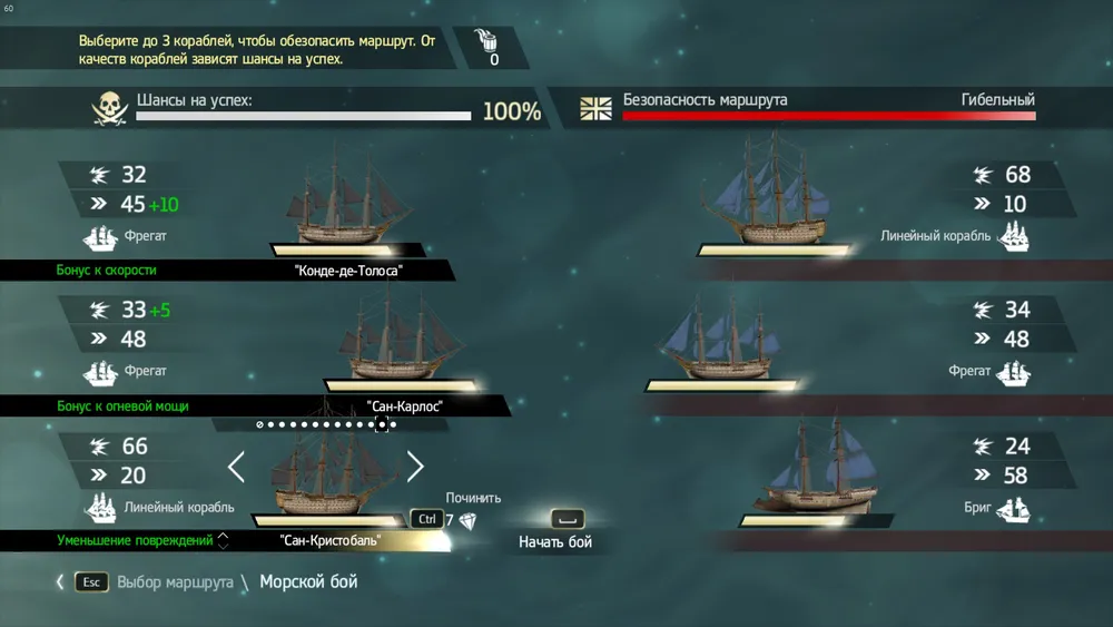 «Галка» в «Blасk Flаg» – это, по сути, самостоятельный персонаж со своим запасом «здоровья» и набором статов. Первое убывает, когда судну наносится урон (в бою или при столкновении с объектами окружения), вторые мы повышаем на протяжении чуть ли не всей игры. Автореген корабельного «здоровья» в бою невозможен, а вне боя оно самостоятельно восстанавливается лишь частично. Поврежденную посудину приходится чинить либо в порту за добытые нелегким пиратским трудом реалы, либо бесплатно прямо в море, пустив на это только что взятое на абордаж вражеское судно. Практически любой корабль противника сгодится в качестве «хилки» для «Галки», если, конечно, вы сумеете его одолеть. Прокачка личного брига нашего героя заметно усложнилась со времен третьей части. Для «Аквилы», если помните, Коннору достаточно было купить несколько улучшений, пусть и по немалой цене. Эдварду же понадобятся не только деньги (много денег), но и ресурсы – дерево, металл, ткань. А еще чертежи, без которых невозможно апнуть ряд характеристик до максимума. Ресурсы и реалы в хорошем количестве дропаются с побежденных судов, что делает их фарм жизненно необходимым занятием в четвертом «Ассасине». Чертежи извлекаются из разбросанных по игровому миру сундуков или же привозятся флотом Кенуэя (аналог собственного Братства из предыдущих игр – о нем ниже) из дальних стран. Выходит, лутосбором и игрой в игре также не стоит пренебрегать. Меню прокачки нашего брига включает около двух десятков позиций, каждую из которых предлагается улучшить от двух до семи раз – схема, напоминающая систему улучшений (upgrades) из «Assassin's Creed: Bloodlines» (в «Родословной», правда, позиций было меньше, всего семь; одни из них просто разблокировались, другие игра позволяла не только разблокировать, но и апгрейдить до второго или даже пятого уровня). А еще «Галку» (в отличие от «Аквилы») можно кастомизировать – менять ей паруса, носовую фигуру и штурвал, разнообразных вариантов коих тоже изрядное количество.