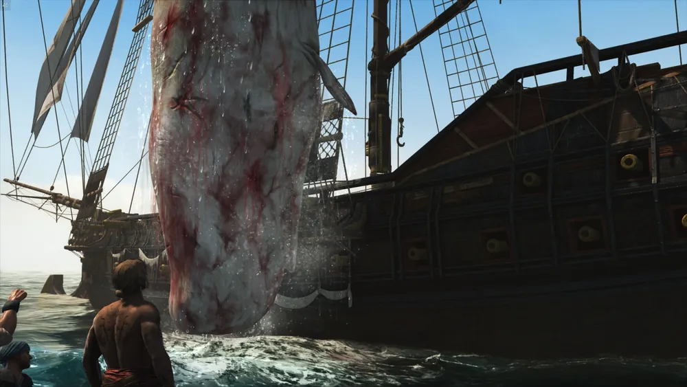 Впрочем, как уже было сказано выше, только адаптациями и доработкой старого разработчики «Assassin's Creed IV: Black Flag» не ограничились. Большинство нововведений было связанно, естественно, с «морским» геймплеем. Трофеи гарпунной рыбалки поражают своими размерами – киты, акулы, косатки. Охотиться на них игра позволяет только в строго отведенных для этого местах, а ресурсы, дропающиеся с мегарыбок, можно либо использовать как сырье для крафта, либо продавать. По сути, рыбалка – это расширение (а не просто адаптация) системы охоты с учетом специфики водных локаций. Набор действий в ней совершенно иной, нежели при отлове сухопутного зверья, однако функция та же. Основная цель дайвинга, то есть погружения с водолазным колоколом – лутосбор. Вот только спокойненько обшаривать дно морское нам не дадут. Для начала придется следить за запасом воздуха – Эдвард хоть и опытный ныряльщик, но все же не Ихтиандр. Затем, неплохо было бы уворачиваться от малоподвижной, но умеющей причинять боль и уменьшать запас здоровья живности – мурен, медуз, морских ежей. А чтобы капитан Кенуэй уж точно не подумал, будто жизнь удалась, в подводные локации завезли акул. От них можно ныкаться в зарослях водорослей и среди остовов затонувших кораблей или отбиваться. Последнее обставлено как QTE сцена. Укокошить морского хищника раз и навсегда не получится, только отогнать на время. Погружение, как и гарпунная рыбалка, доступно исключительно в предназначенных для этого точках на карте. Все подводные области представляют собой отдельные локации, куда мы попадаем после просмотра стандартной загрузочной катсцены (и в этом «Черный флаг» отличается от «Освобождения», где подводные тоннели и пещеры представляли собой просто участки более обширных коридорных локаций). Нырять без ограничений в любой точке любого водоема и без всяких загрузочных «заглушек» протагонист серии «Аssаssin's Сrееd» научится лишь в «Истоках».