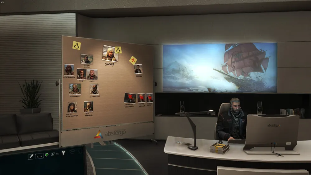 Современность в четвертом «Ассасине» – это развитие соответствующих идей из «Assassin's Creed: Liberation», о чем нам недвусмысленно намекнут в первой же сюжетной миссии в настоящем. Да, как таковых наших дней в «Освобождении» не было, но они подразумевались. В «Черном флаге» подразумеваемое материализовалось в играбельный контент. Наш протагонист в 2013 г. – начинающий аналитик Abstergo Entertainment, той самой компании, которая ранее «создала» игру про Авелину де Грандпре. В его обязанности входит поиск интересных историй из прошлого (например, из эпохи золотого века пиратства), могущих стать основой для фильма или видеоигры. И это, пожалуй, все, что нам о нем известно. В остальном наш протагонист абсолютный ноунейм. Ни его пол, ни возраст, ни имя, ни внешность не уточняются, и установить их не представляется возможным, поскольку мы играем от первого лица полностью безмолвным персонажем. Подобная деперсонализация означала, что на самом деле роль героя современности отводилась игроку. Данная концепция просуществует в серии по «Синдикат» включительно.