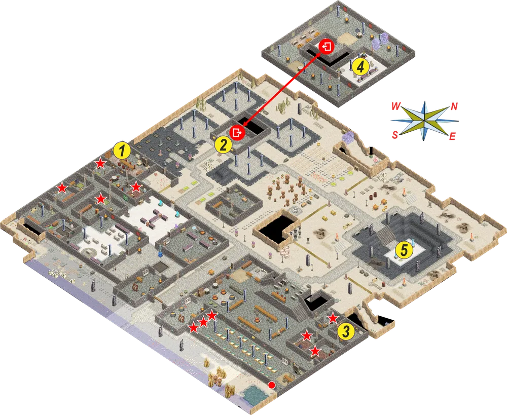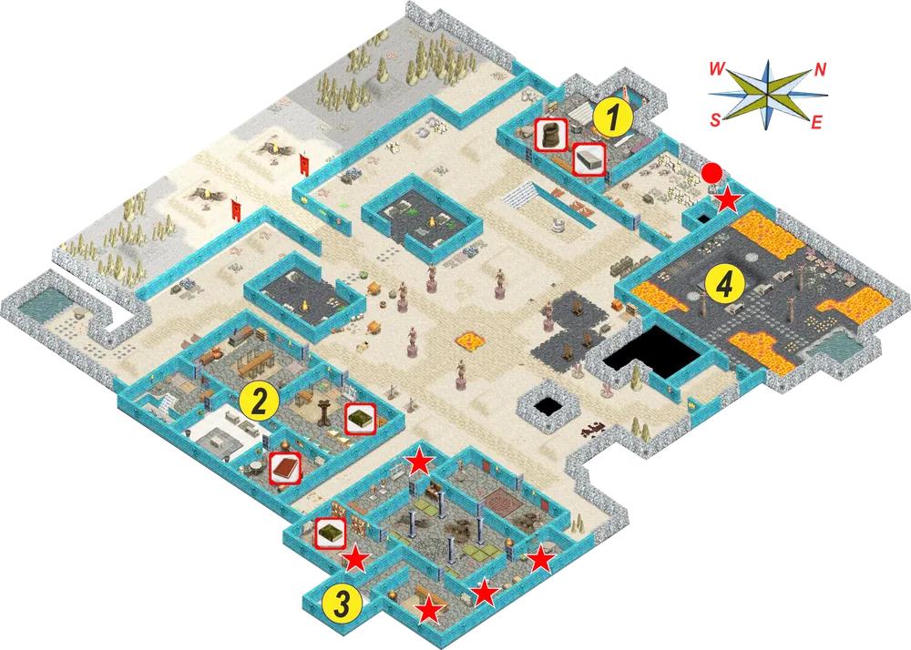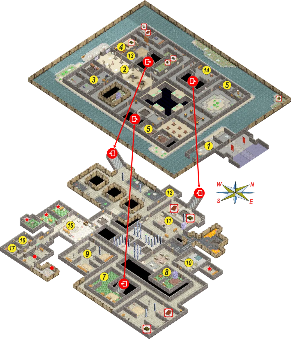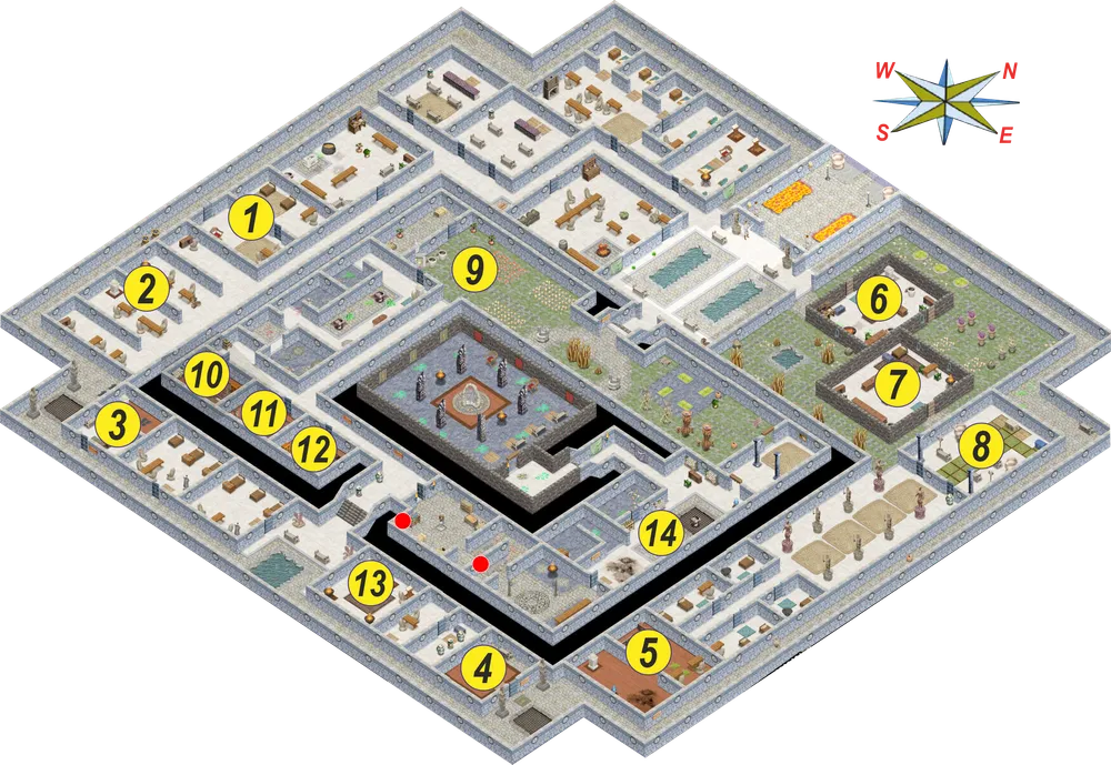 1 – ваша комната. 2 – библиотека. 3 – Келнер. 4 – портал к ванатай. 5 – Икс. 6 – алхимическая мастерская. 7 – магазин. 8 – храм истинного пути. 9 – Сюзанна. 10 – покои Остота. 11 – покои Махдави. 12 – покои Пирна. 13 – комната с тремя томами. 14 – Видрейн.