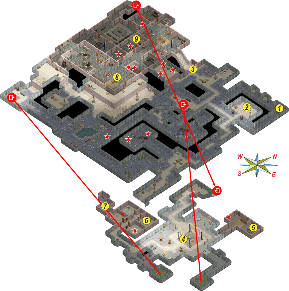 1 – рычаг. 2 – люк. 3 – ворота. 4 – алтарный зал. 5 – магический том. 6 – капитан Брехон. 7 – сталагмит. 8 – вождь Фисс`Тшссс. 9 – магическая книга.