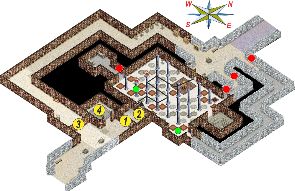 1, 2, 3 – ворота. 4 – лебедка. Красные круги – секретные кнопки. Зеленые круги – плиты с рунами.
