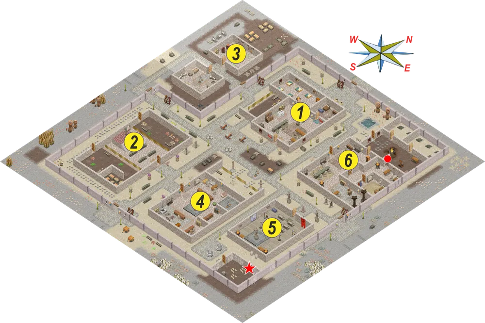 1 – таверна. 2 – аукцион. 3 – амбар. 4 – базар. 5 – храм. 6 – тюрьма.