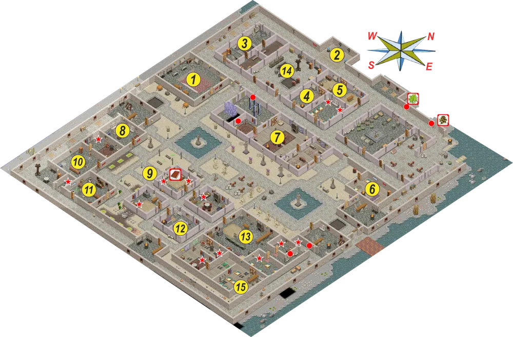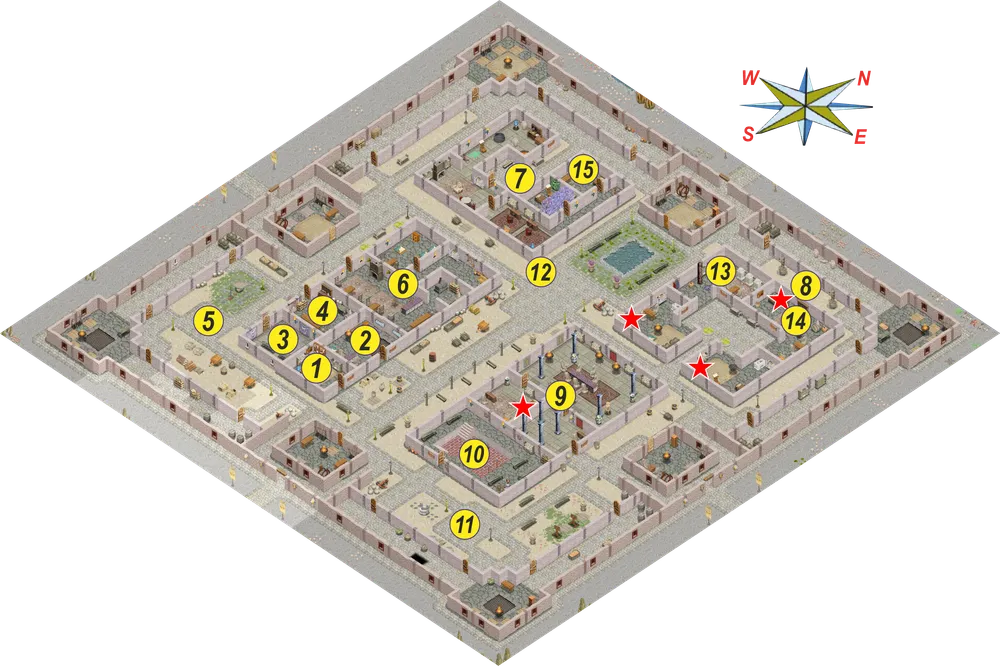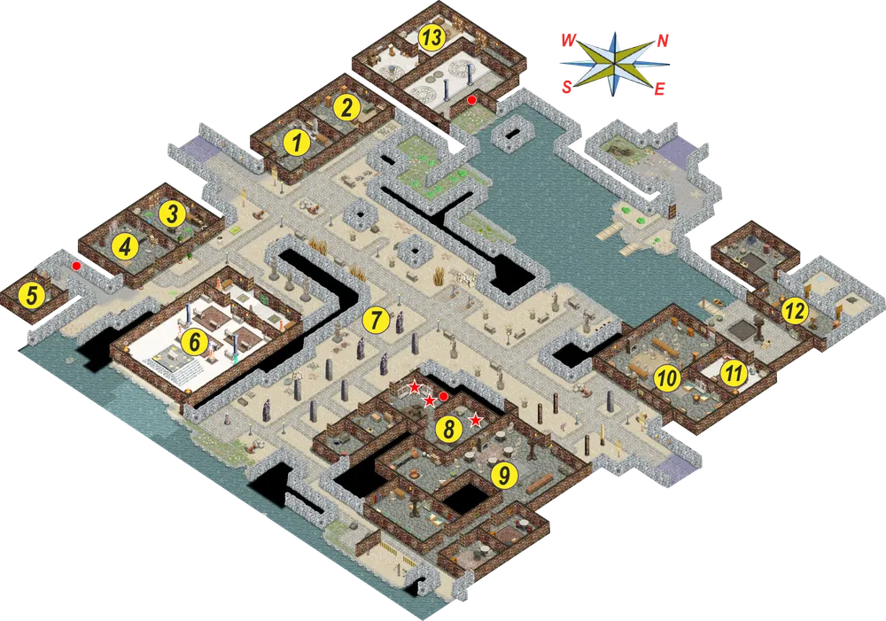 1 – учебный зал. 2 – магический пилон. 3 – загоны для зверей. 4 – Эбби. 5 – квартирмейстер Дирк. 6 – лечебница. 7 – ратуша. 8 – магазин оружия Шеннон. 9 – доска объявлений. 10 – магазин старых доспехов Джея. 11 – аптека. 12 – комод с заклинанием Спешка, уровень 3. 13 – таверна. 14 – склад. 15 – шпионская явка.