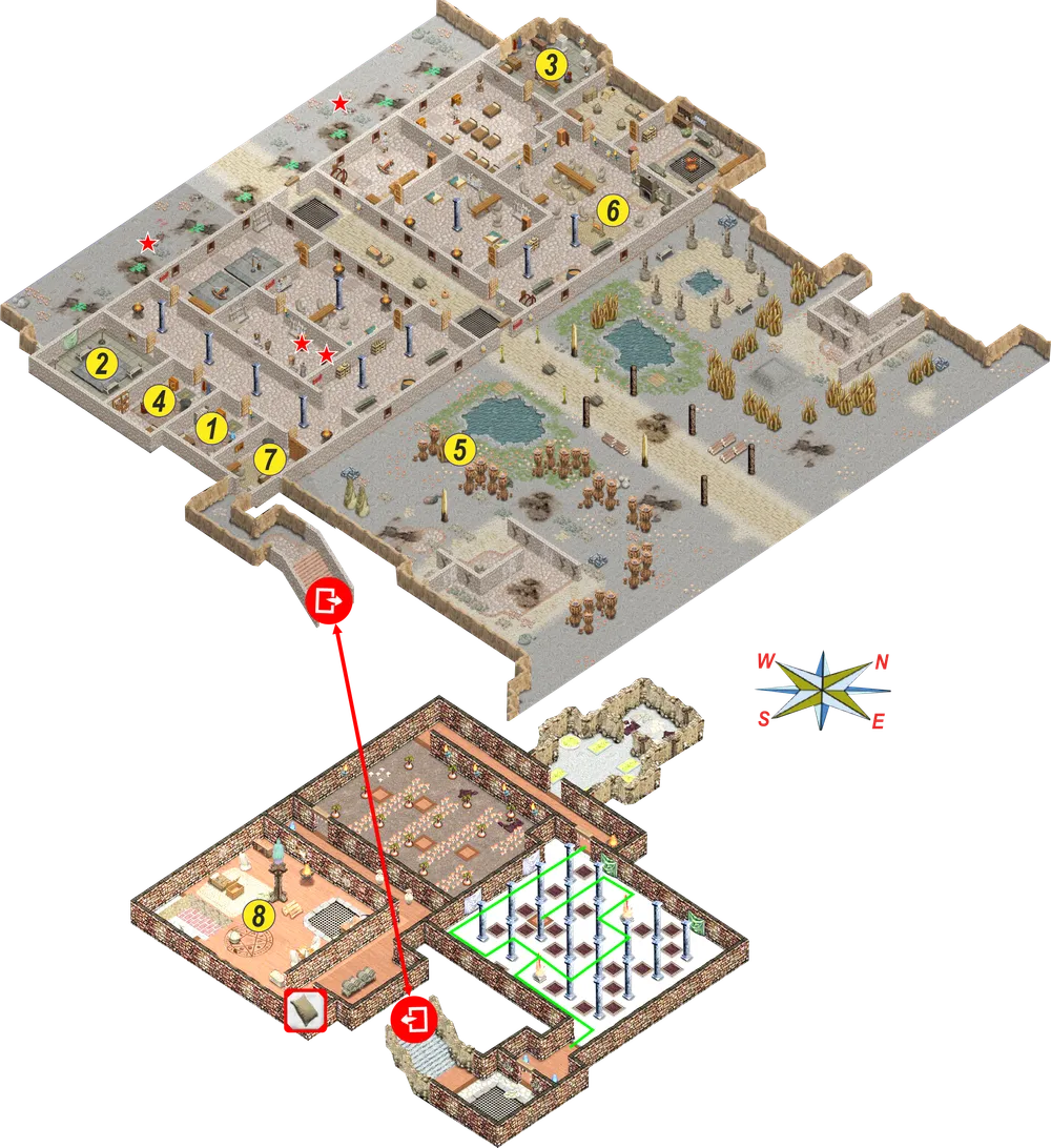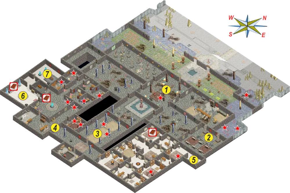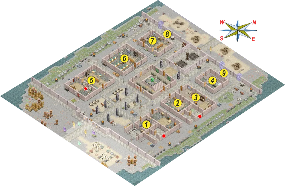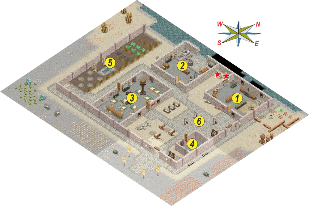 1 – мать Мейдж. 2 – святилище. 3 – командир Лори. 4 – западная гостевая комната. 5 – квартирмейстер Анагарахад. 6 – маг Фрайтус. 7 – восточная остевая комната.