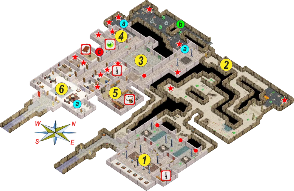 1 – зал с рычагами. 2 – голодные статуи. 3 – вестибюль. 4 – Сиксус. 5 – кухня. 6 - центральный зал. а – стены, разрушаемые магией. b – сталагмит. с – магический барьер.